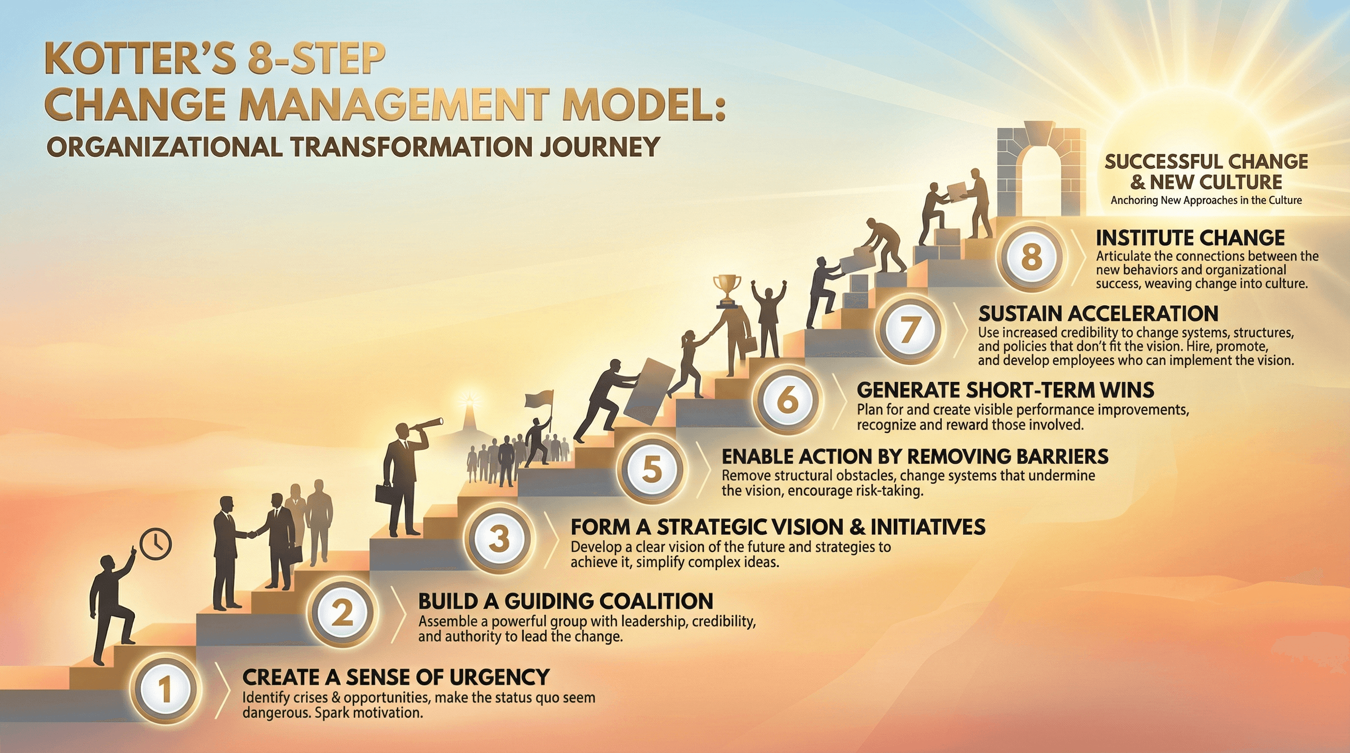 Create a slide explaining Kotter's 8-step change management model. Use an organizational transformation style with ascending staircase graphic representing 8 steps, step numbers in circles, brief descriptions at each level, people silhouettes climbing stairs, sunrise at top representing successful change, warm encouraging colors, and leadership typography.