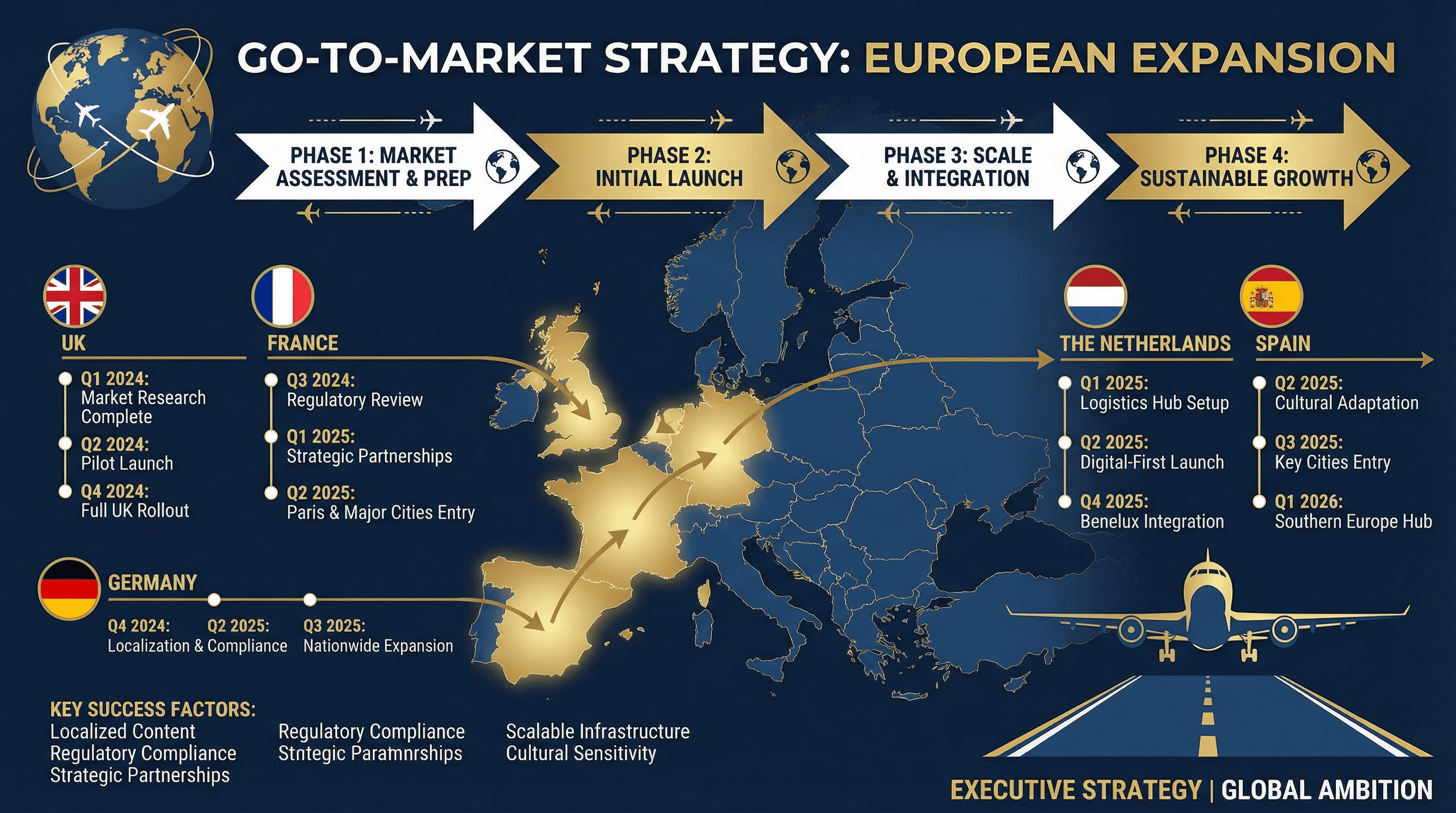 Create a slide outlining the go-to-market strategy for expanding into European markets. Use a global expansion style with European map highlighting target countries, market entry phase arrows, flag icons for each country, timeline milestones, airplane and globe graphics, international business navy colors, and executive strategy typography.