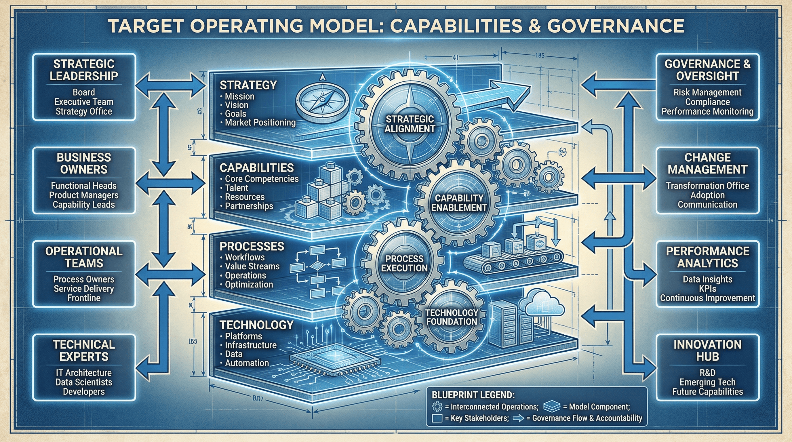Design a slide presenting the target operating model with capabilities and governance. Use an organizational design style with layered model graphic (strategy, capabilities, processes, technology), interconnecting gears showing how elements work together, role boxes, governance arrows, blueprint aesthetic, and architectural organization typography.