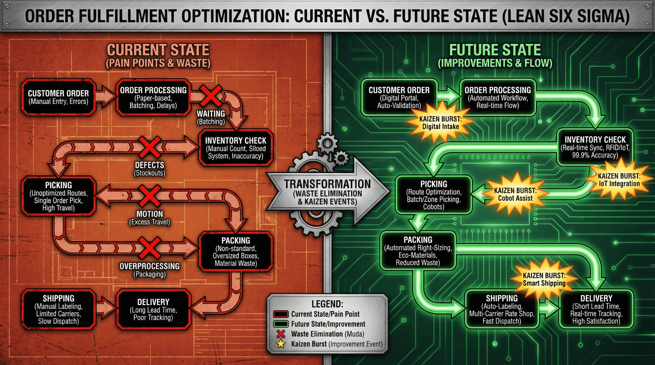 Design a current vs future state process map for order fulfillment optimization. Use a lean six sigma style with side-by-side process flows, current state in red/orange showing pain points, future state in green showing improvements, waste elimination X marks, kaizen burst stars, industrial efficiency aesthetic, and process engineering typography.