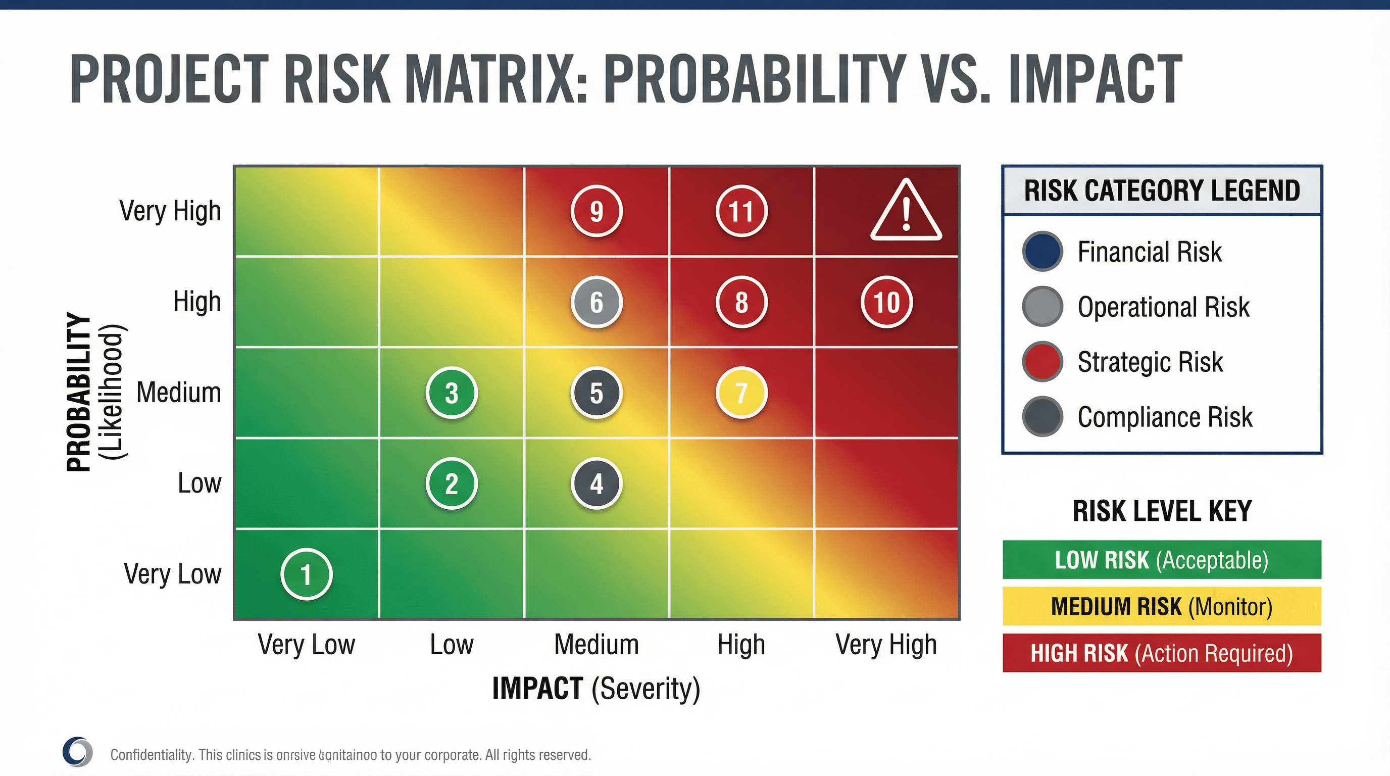 Create a slide with a risk matrix showing probability vs impact for project risks. Use a risk management style with 5x5 heat map grid (green to yellow to red gradient), plotted risk items as numbered circles, risk category legend, warning triangle icons, corporate governance colors (navy, gray, red), and serious risk management typography.