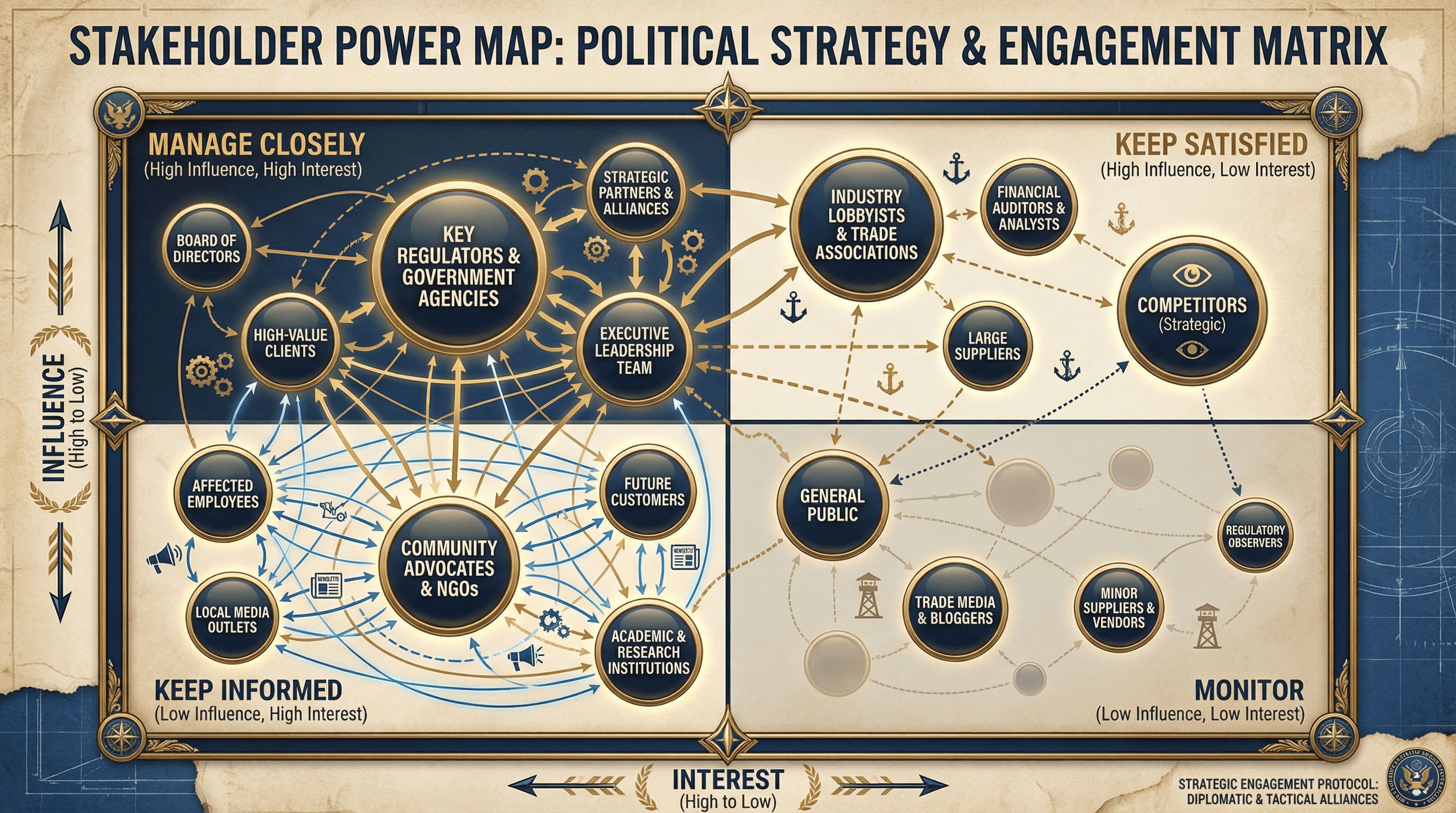Design a slide mapping stakeholders by influence and interest in a 2x2 matrix. Use a political strategy style with quadrant grid, stakeholder names in positioned bubbles sized by importance, quadrant labels (Manage Closely, Keep Satisfied, Keep Informed, Monitor), connection lines showing relationships, diplomatic navy and gold colors, and strategic typography.