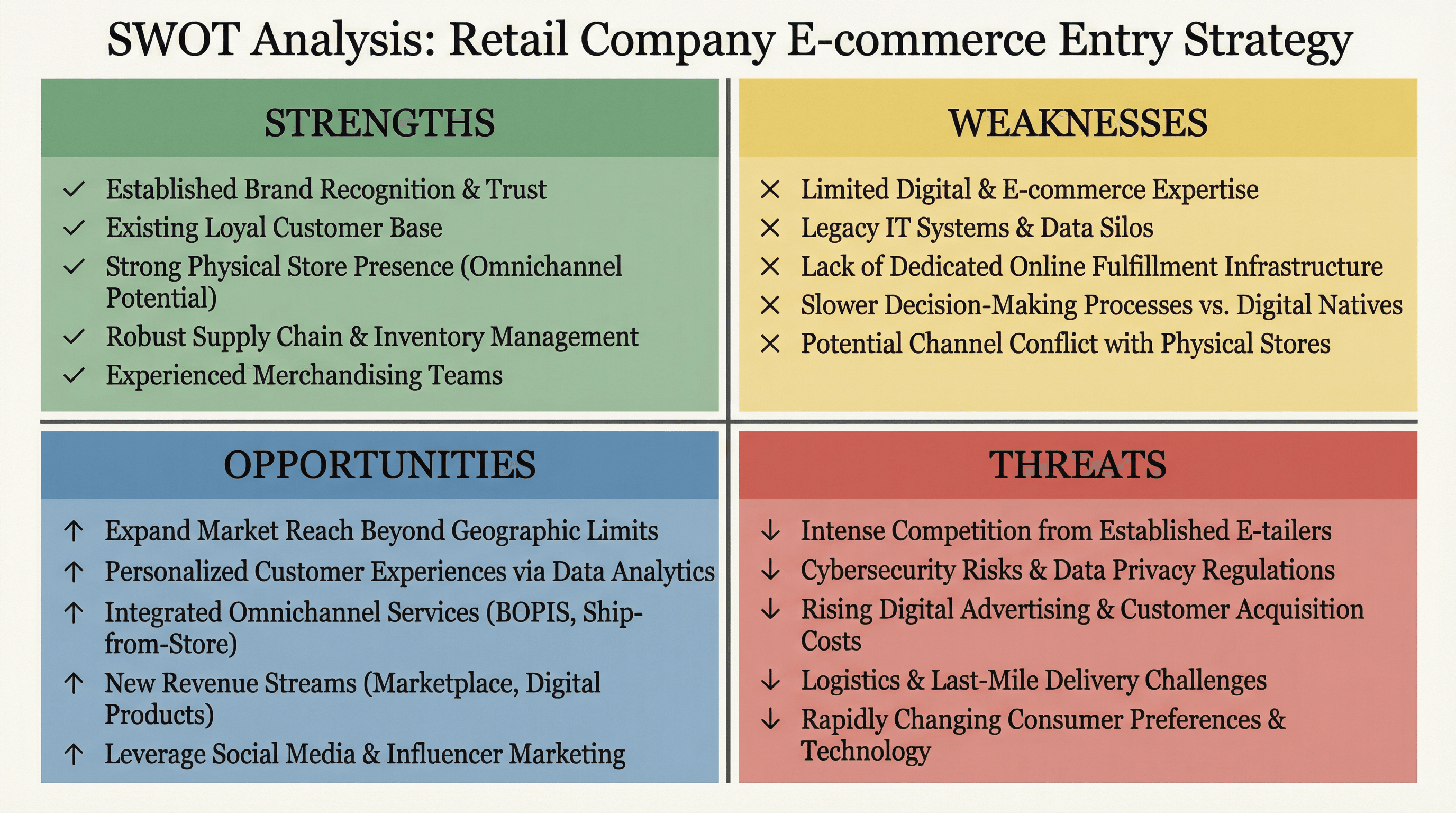 Design a 4-quadrant SWOT analysis slide for a retail company entering e-commerce. Use a classic consulting framework style with four equal quadrants in distinct colors (green strengths, yellow weaknesses, blue opportunities, red threats), bold quadrant labels, bullet point lists, clean dividing lines, BCG/McKinsey aesthetic, and professional serif headers.