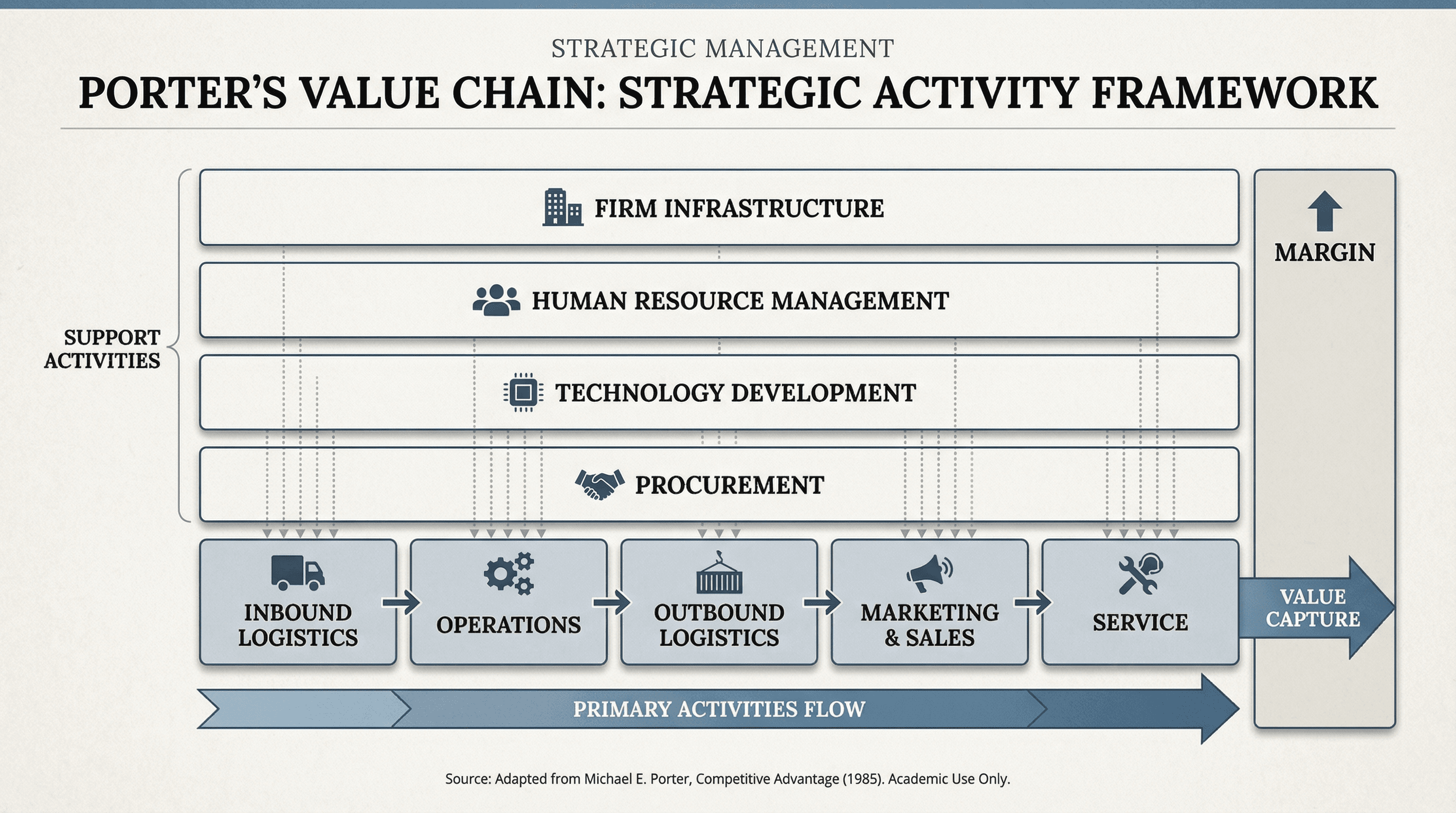 Design a slide showing primary and support activities in Porter's value chain. Use a strategic framework style with horizontal arrow showing primary activities flow, support activities stacked above, activity boxes with icons, margin indicator on right, interconnecting dotted lines, academic business school aesthetic, and strategic management typography.