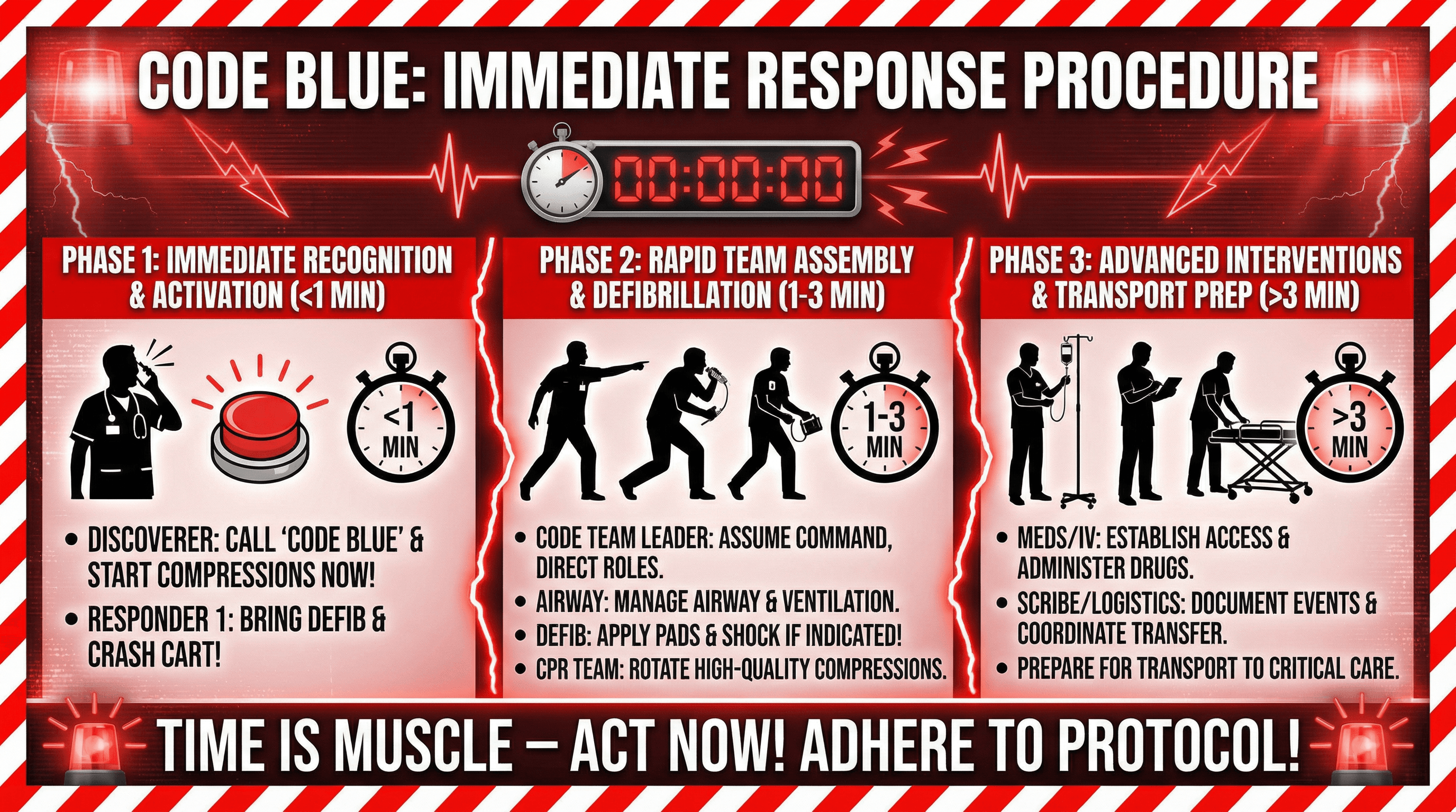 Create a slide outlining code blue response procedure with roles and timing. Design in an urgent alert style with bold red and white high-visibility colors, warning stripe borders, stopwatch graphics showing response times, silhouette figures in action poses, flashing light icon effects, and impact-heavy bold condensed typography demanding immediate attention.