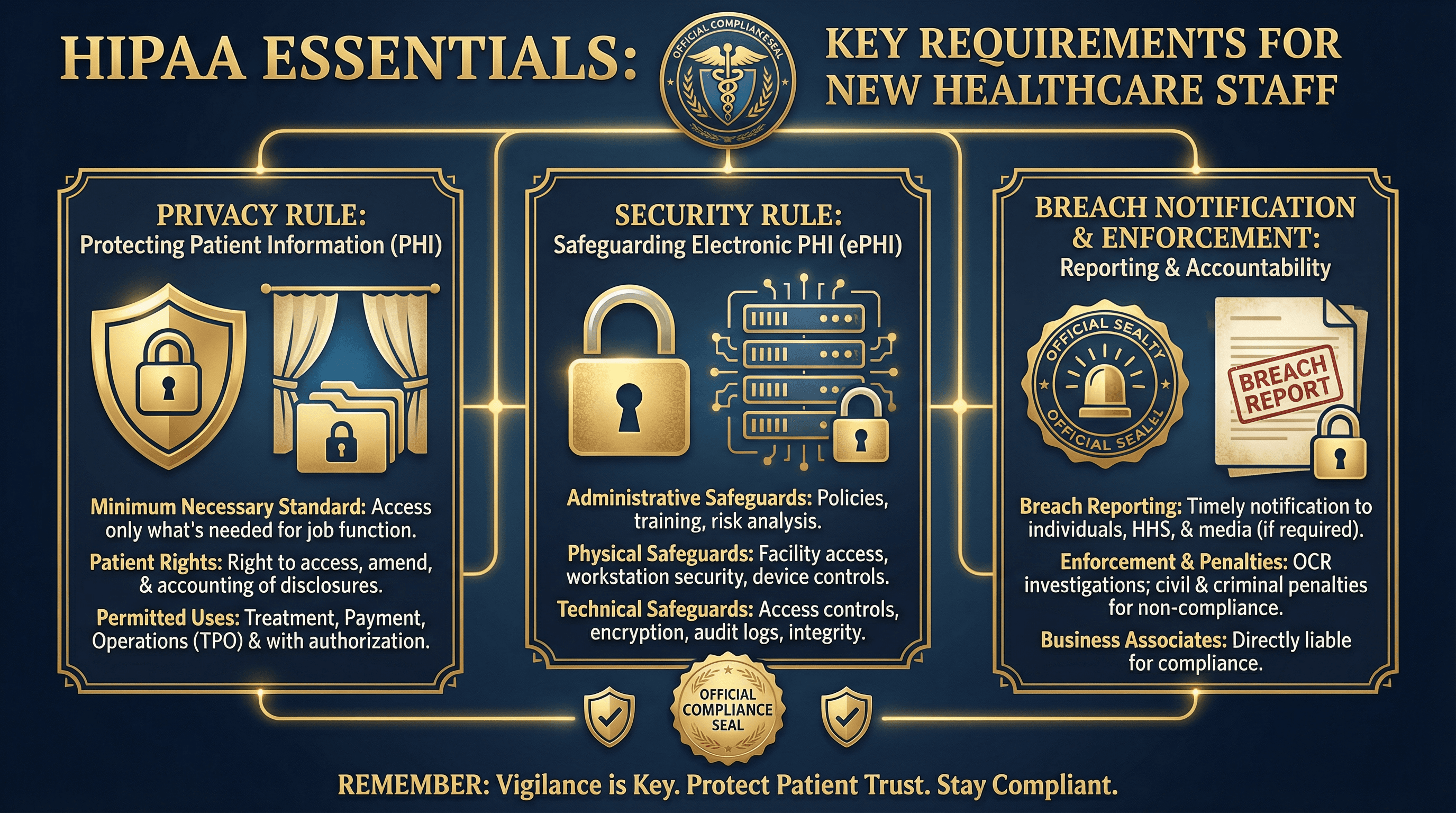 Design an infographic slide explaining key HIPAA requirements for new healthcare staff. Use a security-focused style with shield and lock iconography, deep navy and gold trustworthy color palette, document and folder graphics with padlock overlays, privacy curtain imagery, official seal emblems, and authoritative government-style typography.
