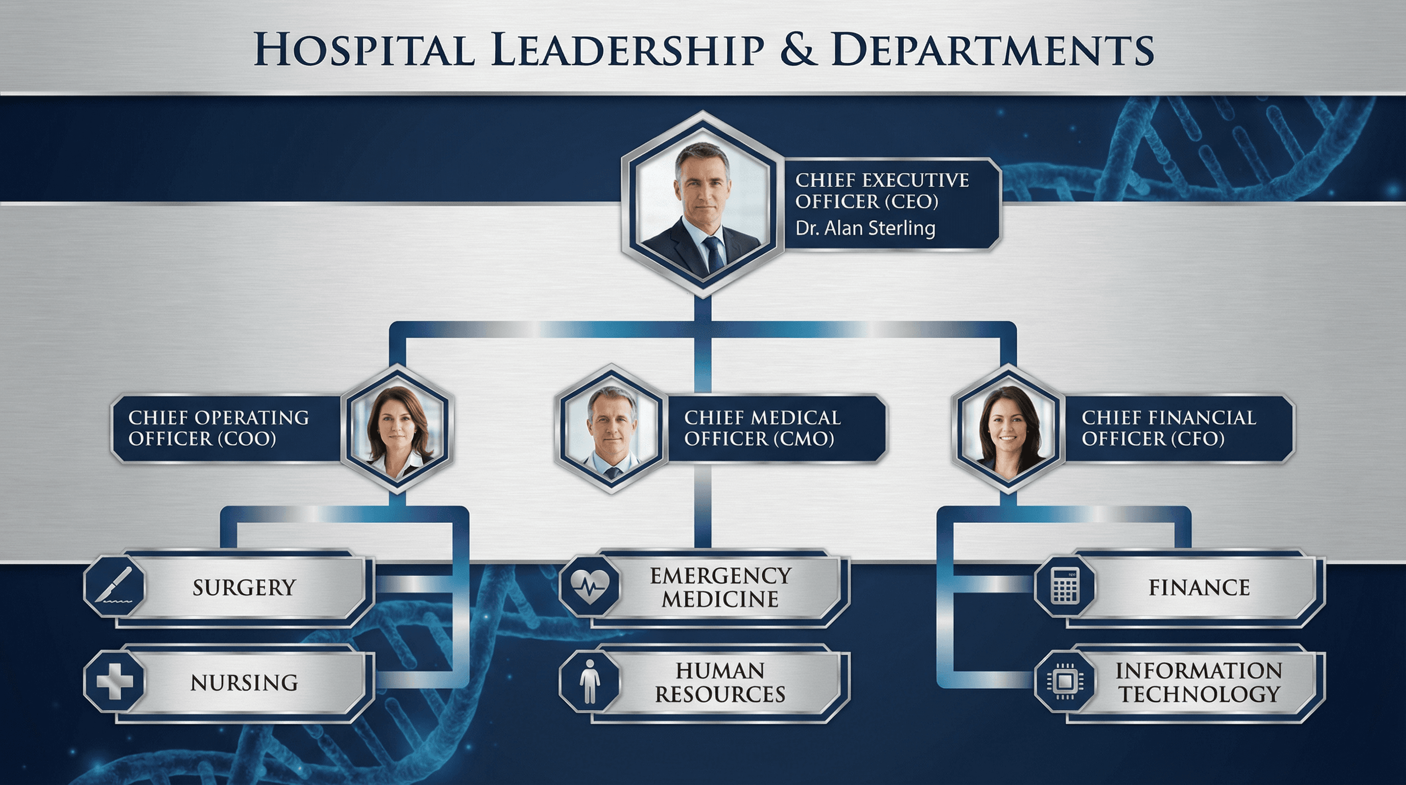 Design an organizational chart showing hospital leadership and departments. Use a corporate medical style with navy blue and silver color palette, hexagonal photo frames for executives, clean hierarchy lines with gradient fills, subtle DNA helix pattern in background, modern geometric shapes, and prestigious serif typography for titles.