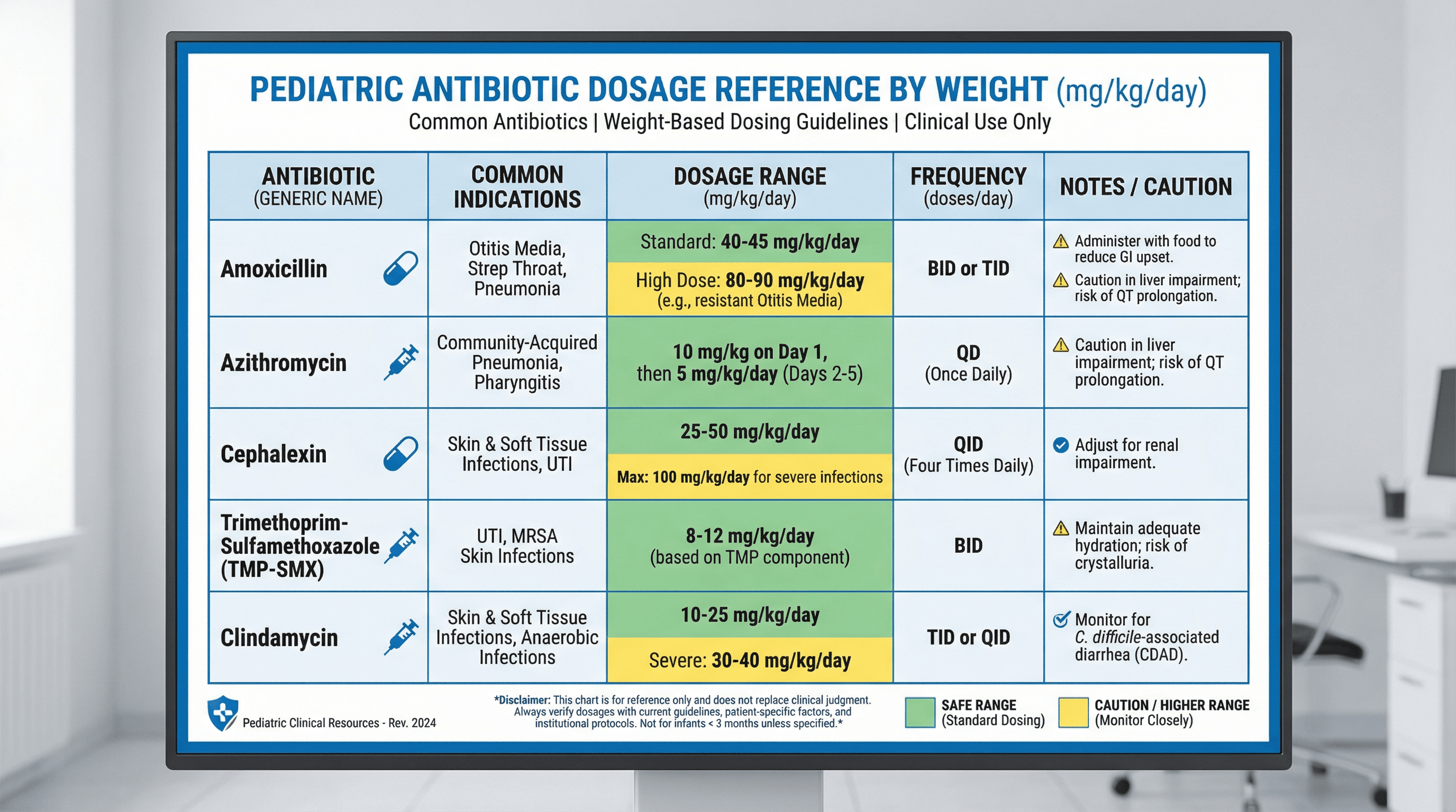 Create a clinical reference slide showing pediatric medication dosages by weight for common antibiotics. Design in a sterile medical chart style with crisp white background, hospital blue headers, precise grid lines, pill and syringe icons in flat design, color-coded dosage ranges (green for safe, yellow for caution), and clear Helvetica typography with high contrast.