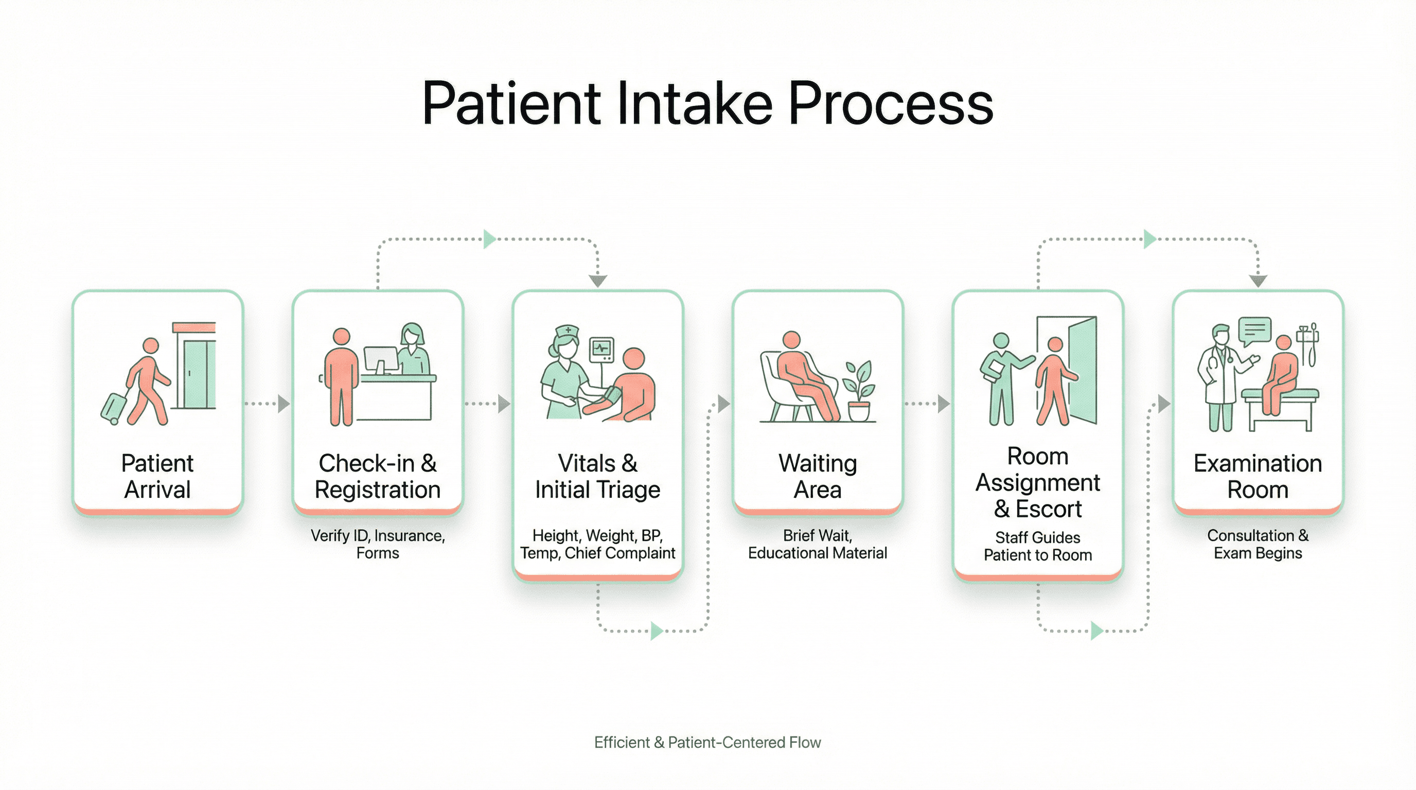 Design a flowchart slide showing the patient intake process from arrival to examination room. Use a modern healthcare UI style with soft mint green and coral accents on white, rounded rectangular process boxes with subtle shadows, friendly line-art icons of patients and staff, dotted connector lines, and a clean Apple Health-inspired minimalist aesthetic.