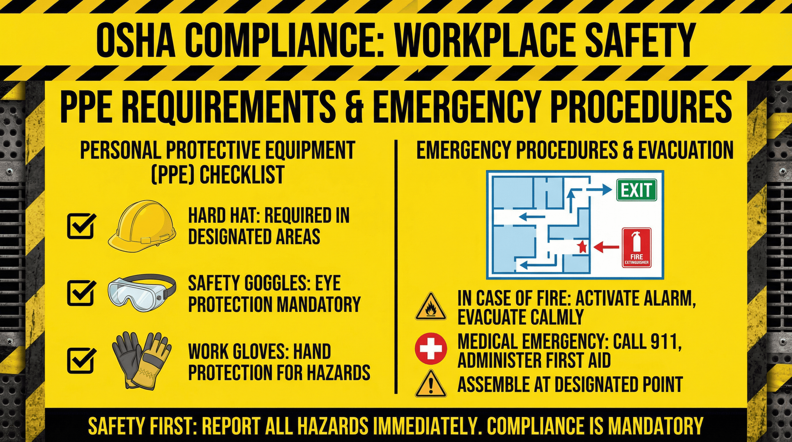 Design a workplace safety slide covering PPE requirements and emergency procedures. Use an OSHA compliance style with high-visibility yellow and black warning colors, PPE equipment illustrations (hard hat, goggles, gloves), emergency exit maps, hazard warning symbols, checklist format, industrial safety aesthetic, and clear safety-critical typography.