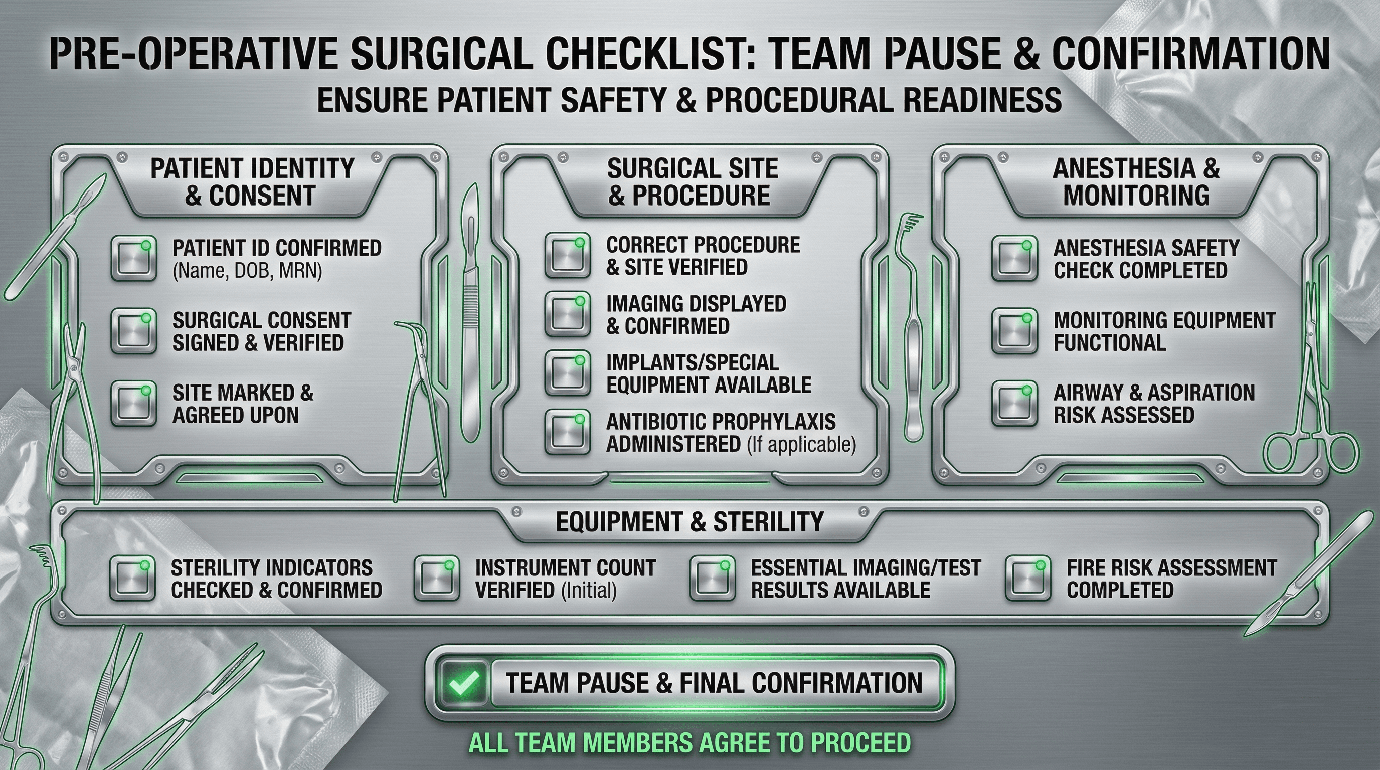 Design a pre-operative checklist slide for surgical teams. Use a surgical steel aesthetic with cool gray gradient background, metallic silver checkbox elements, operating room green accent color, scalpel and medical tool line illustrations, sterile packaging texture overlays, and bold condensed typography resembling medical equipment labels.