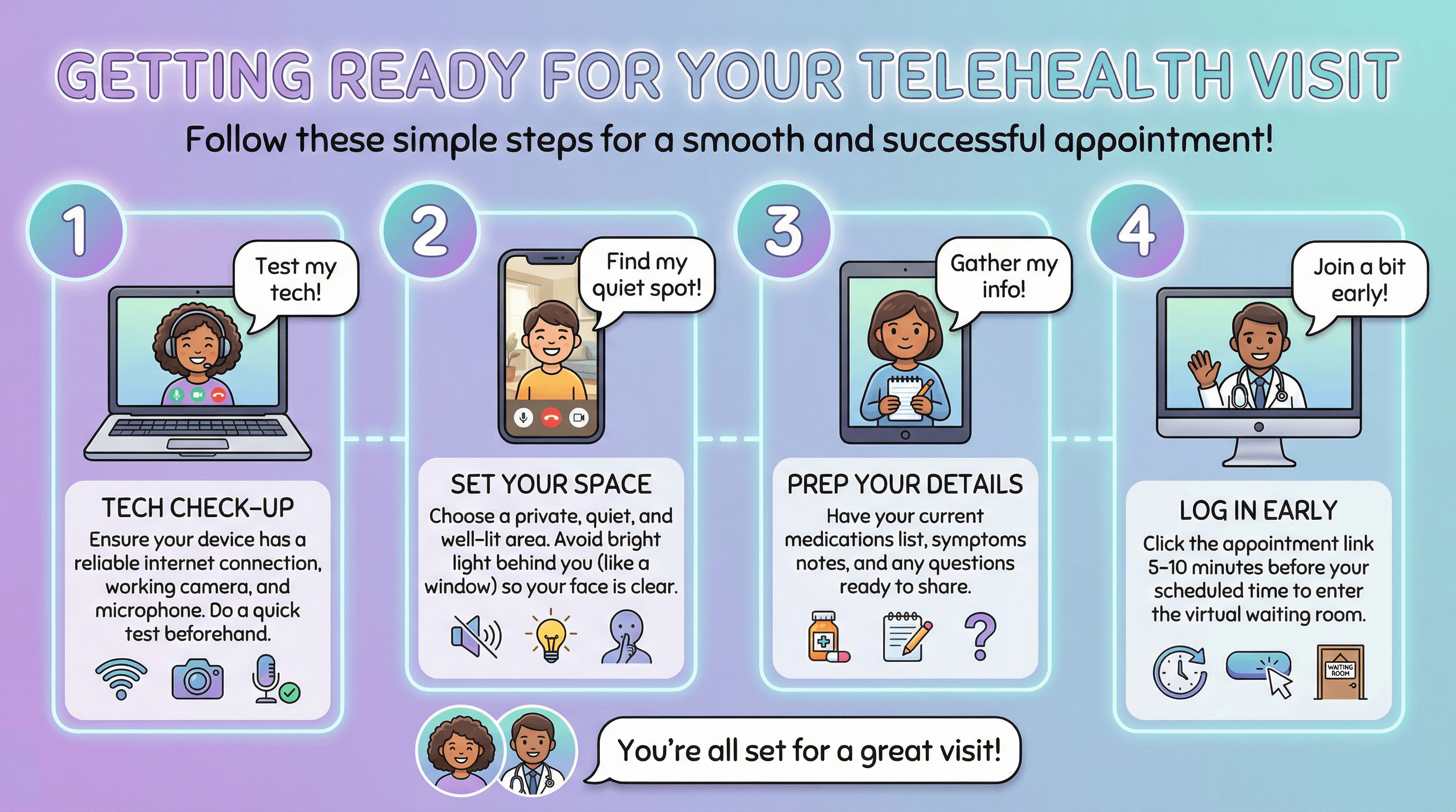 Create a patient-facing slide explaining how to prepare for a telehealth appointment. Design in a friendly tech tutorial style with soft purple and teal gradient, device mockup illustrations (laptop, phone) with video call interfaces, numbered step circles, cheerful patient avatar illustrations, speech bubble callouts, and approachable rounded sans-serif fonts.