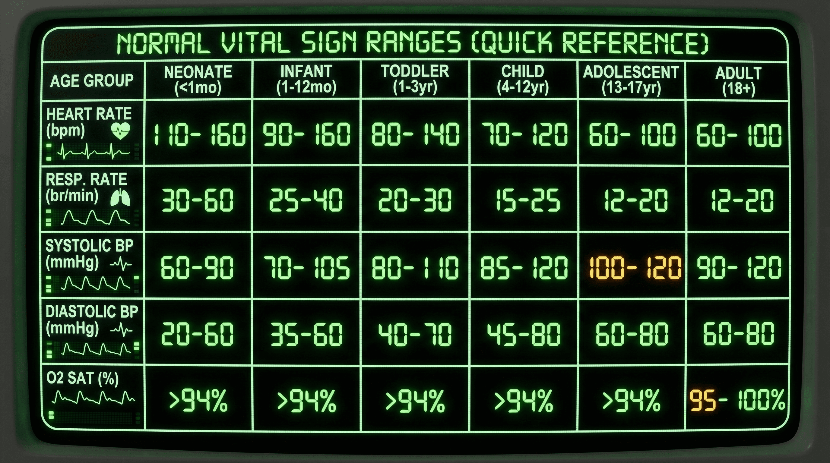 Create a quick reference slide showing normal vital sign ranges across age groups. Design in a clinical monitor aesthetic mimicking hospital bedside displays with black background, glowing green and amber LED-style numbers, heart rate waveform graphics, digital readout fonts, rounded monitor bezels, and organized grid layout resembling medical equipment interfaces.