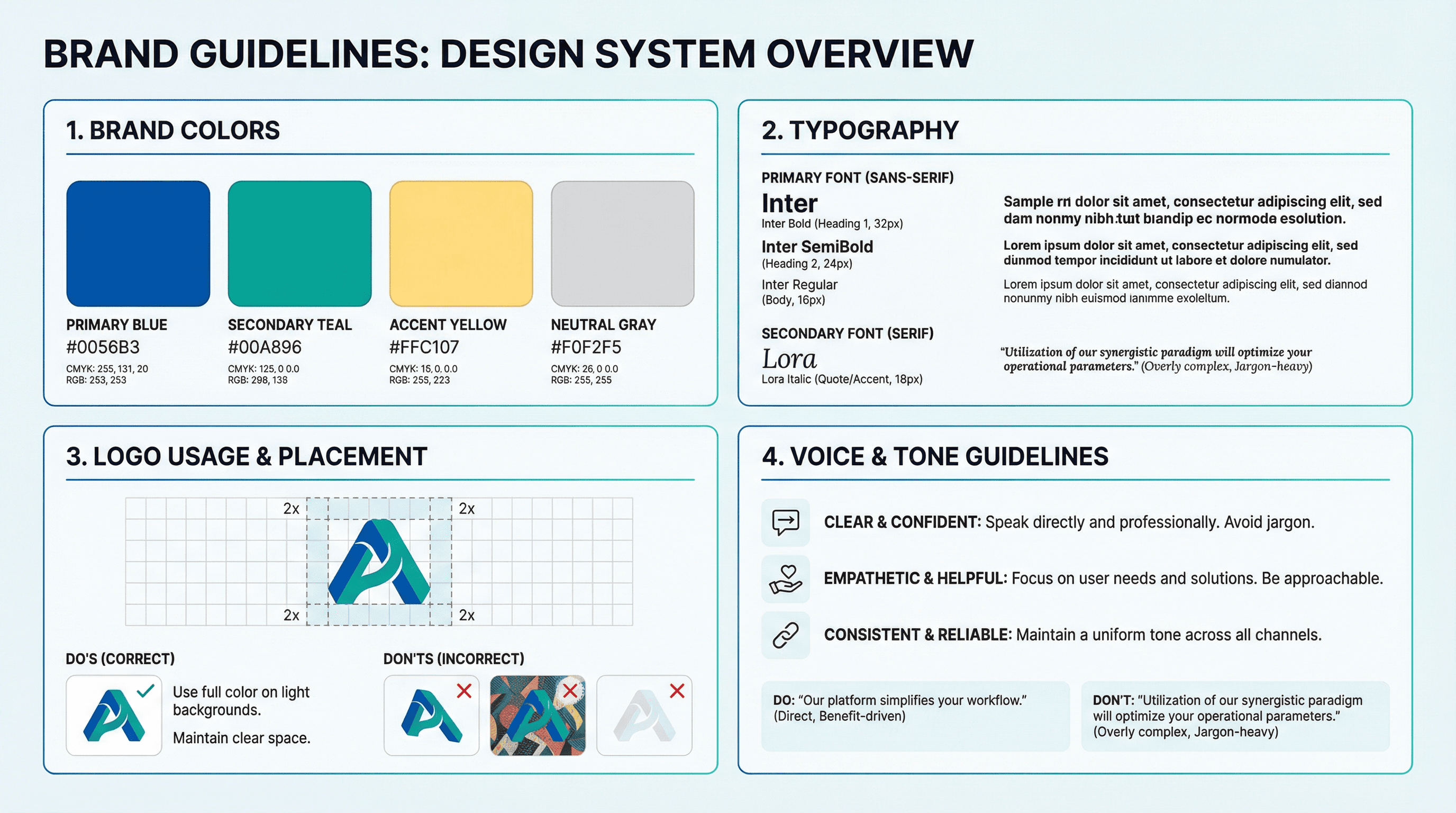 Design a slide presenting brand colors, fonts, logo usage, and voice guidelines. Use a design system style with color swatches showing hex codes, typography specimens, logo placement grid, do's and don'ts examples, spacing measurements, clean white background with brand color accents, and precise specification typography.