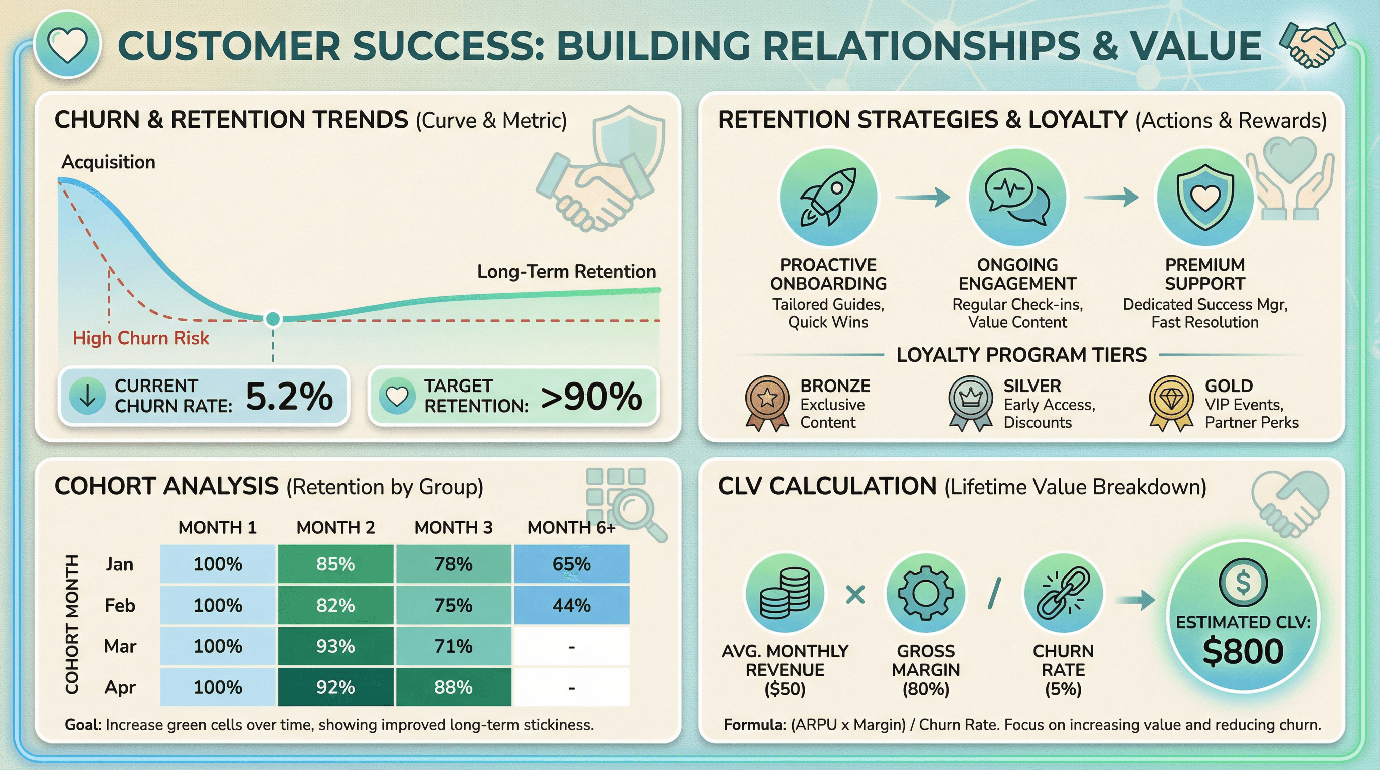 Create a slide showing churn rates, retention strategies, and customer lifetime value. Design in a customer success style with retention curve graph, cohort analysis grid, CLV calculation breakdown, loyalty program icons, heart and handshake graphics, warm retention-focused colors (greens and blues), and relationship-building typography.