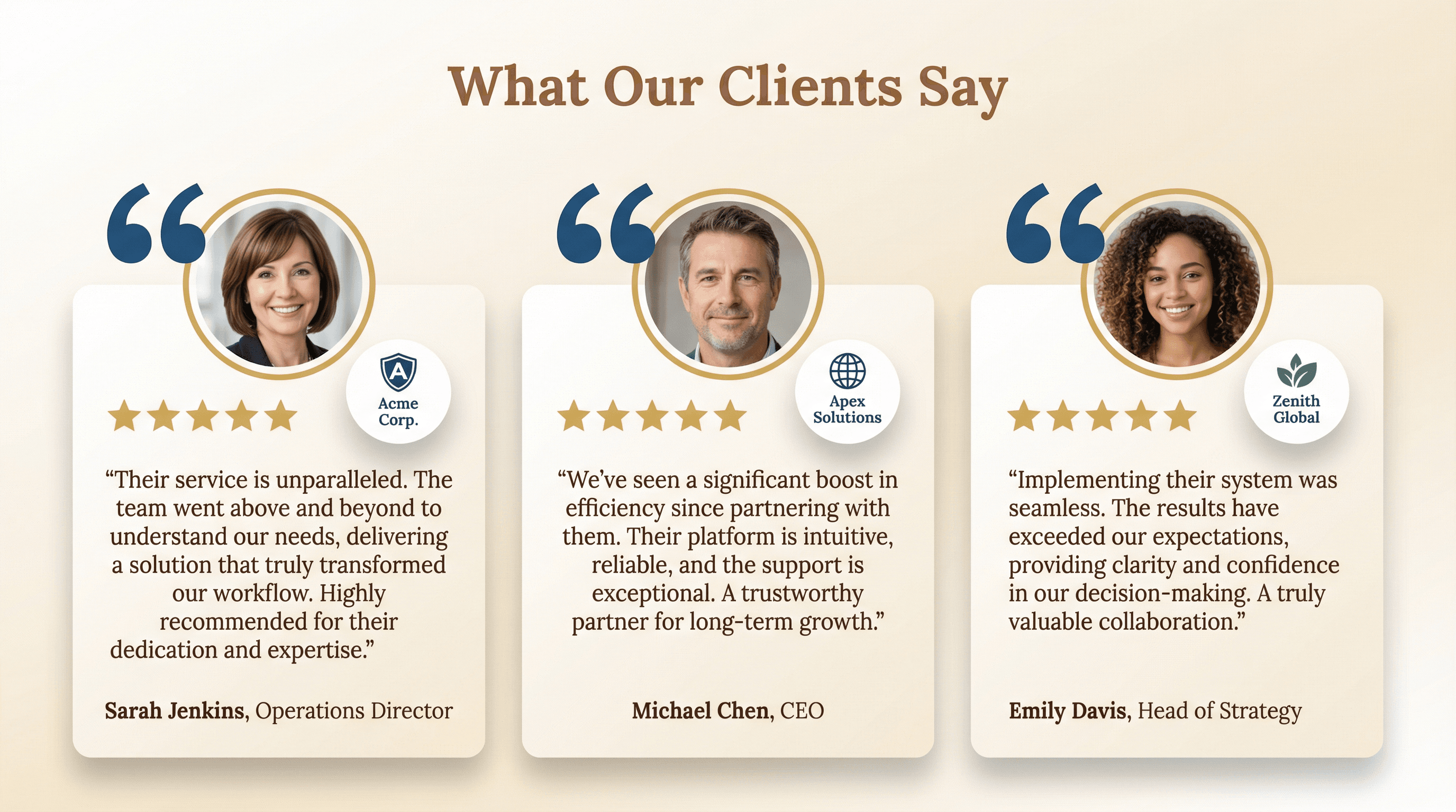 Create a slide featuring 3 customer testimonials with photos and company logos. Design in a trust-building style with circular customer headshot photos, large quotation mark graphics in brand accent color, star rating displays, company logo badges, subtle gradient background, testimonial cards with soft shadows, and warm credible serif quotes.