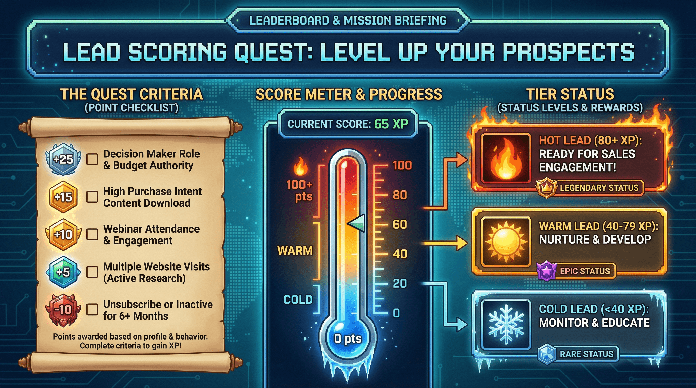 Create a slide explaining the lead scoring methodology with criteria and point values. Use a gamification style with point badge graphics, scoring thermometer visualization, criteria checklist with point values, tier levels (hot/warm/cold leads) with fire/sun/snowflake icons, leaderboard aesthetic, and engaging game-inspired typography.