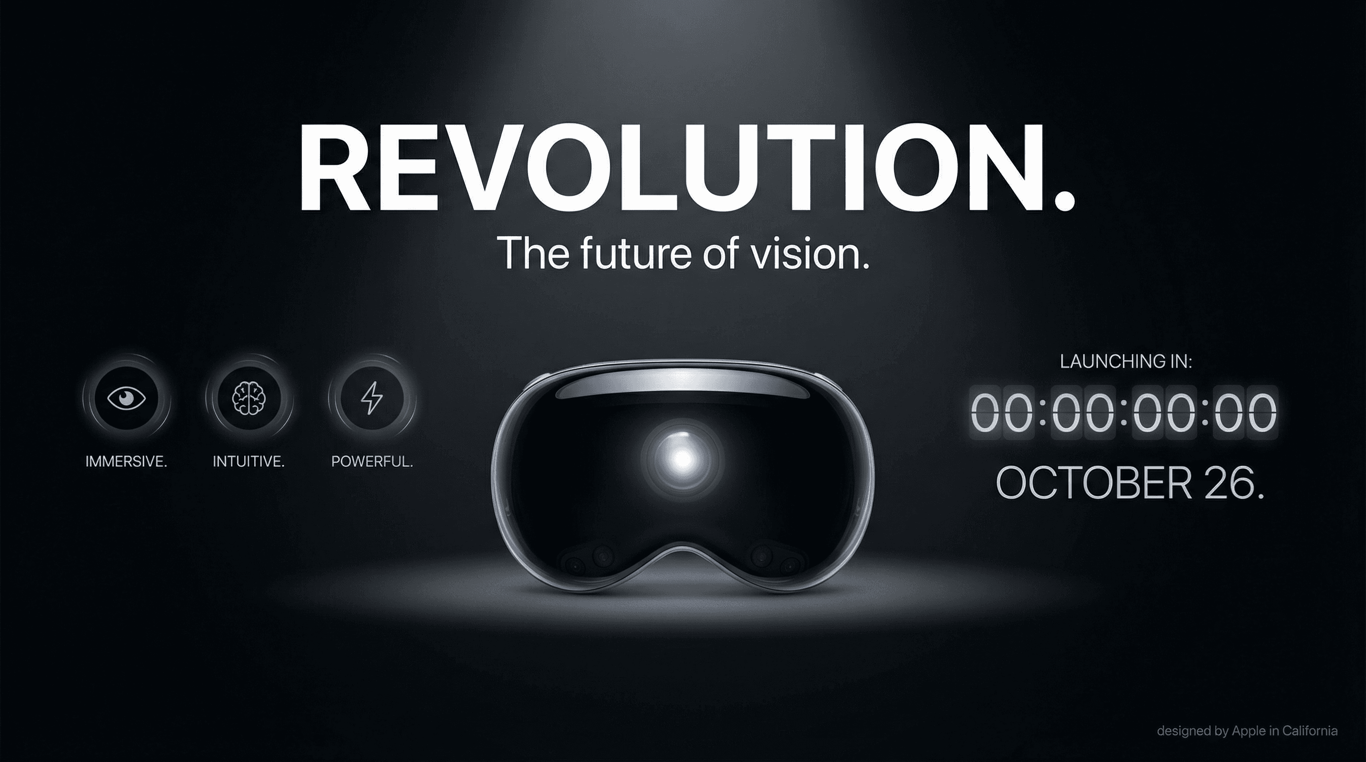 Design an exciting product launch slide with key features and launch date. Use an Apple keynote-inspired style with dramatic dark background, hero product image with spotlight effect, minimal white text with powerful single words, feature icons with subtle animations, countdown timer graphic, and elegant San Francisco Pro typography.