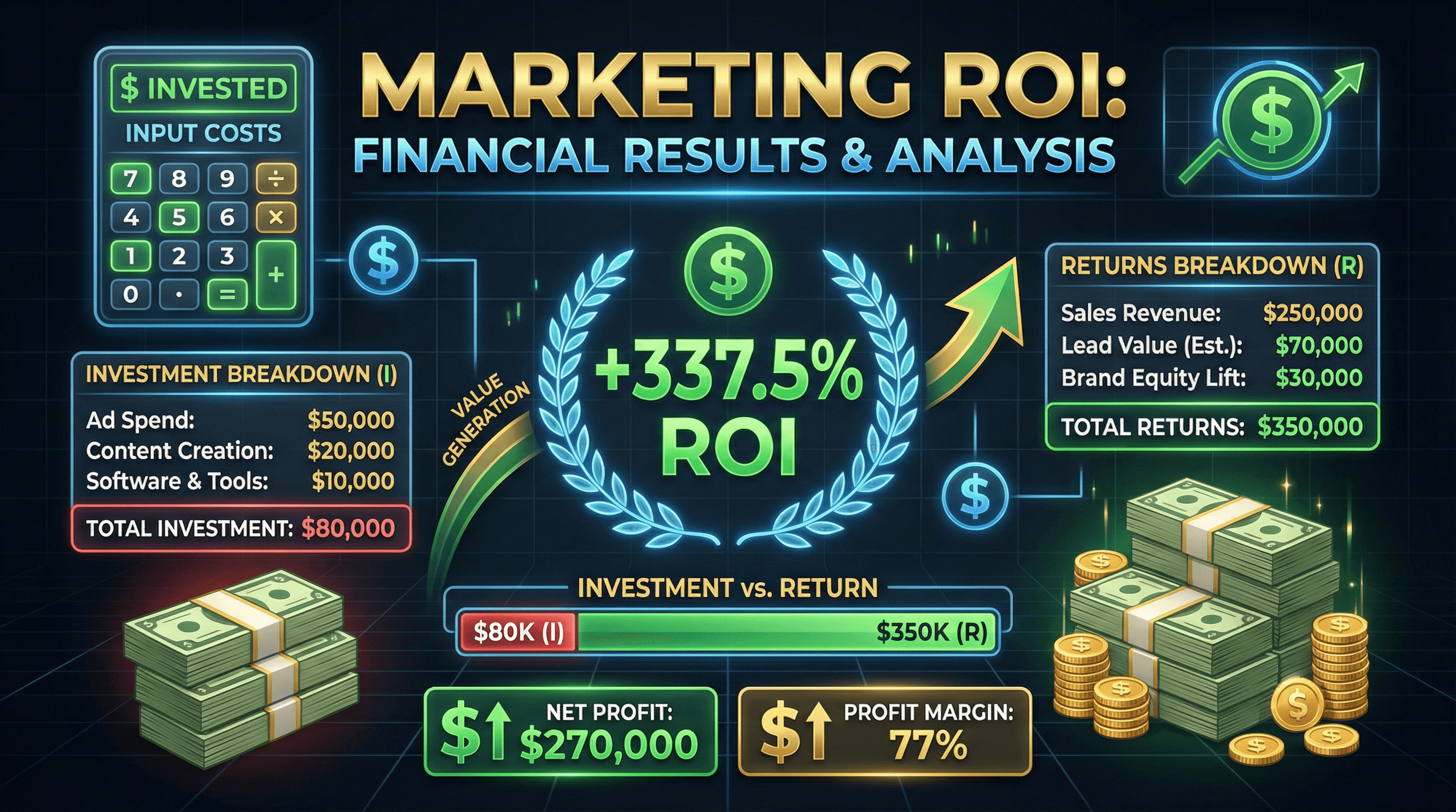 Design a slide showing marketing ROI calculation with investment and returns breakdown. Use a financial results style with calculator graphic, large ROI percentage in green, investment vs return comparison bars, money stack illustrations, upward trending arrow, profit highlight boxes, and impactful financial typography with dollar signs.