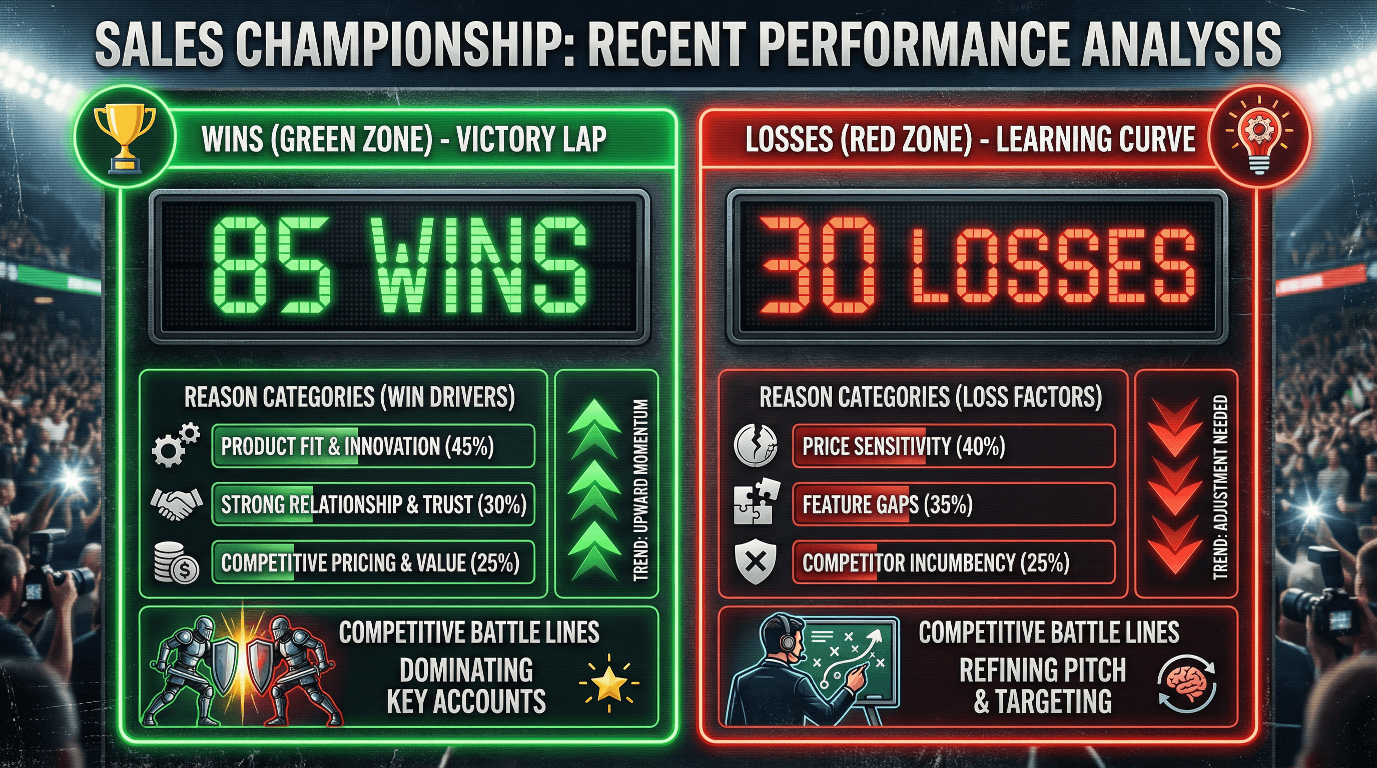 Create a slide analyzing recent sales wins and losses with reasons and trends. Use a sports scoreboard style with wins in green column, losses in red column, reason category breakdowns, trend arrows, competitive battle imagery, victory trophy and learning lightbulb icons, scoreboard number display, and competitive sports typography.