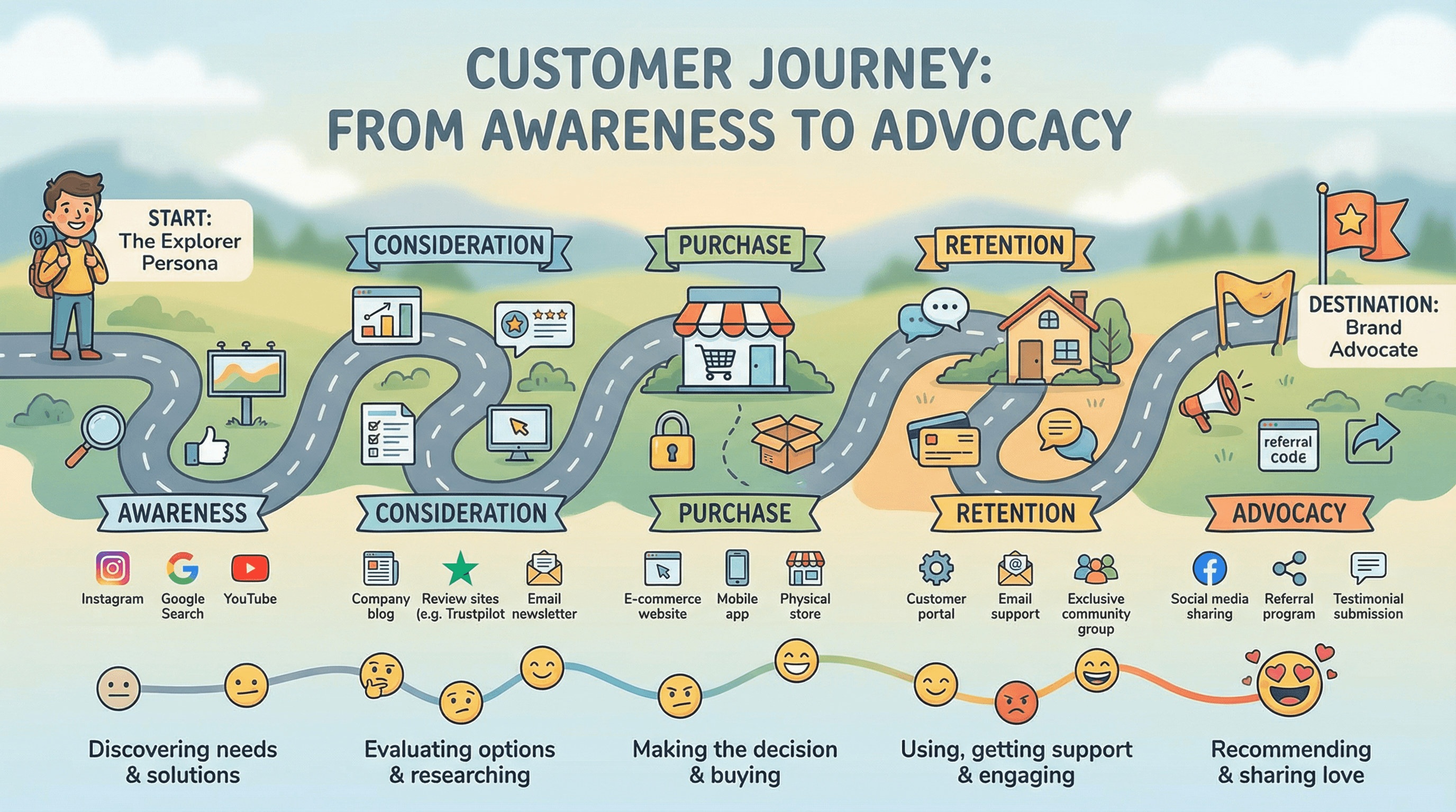 Design a slide mapping the customer journey from awareness to advocacy. Use an experience design style with horizontal journey path as a winding road, touchpoint icons at each stage, emotion indicators (happy to frustrated faces), channel logos, persona avatar at start, destination flag at end, and friendly approachable typography.