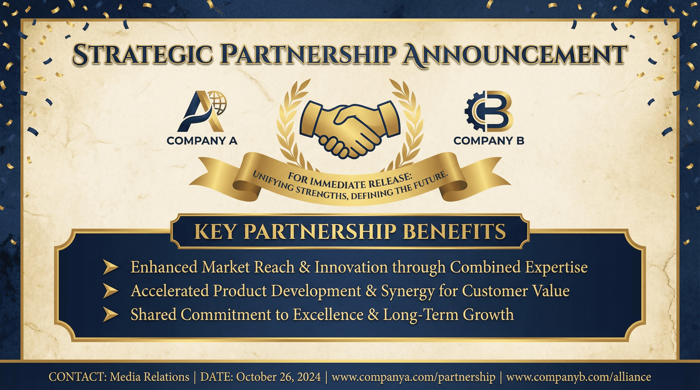 Create a slide announcing a strategic partnership with both company logos and benefits. Design in a press release style with both logos prominently displayed with handshake graphic between them, partnership benefits in elegant bullet points, celebratory confetti accents, premium navy and gold colors, and formal announcement typography.