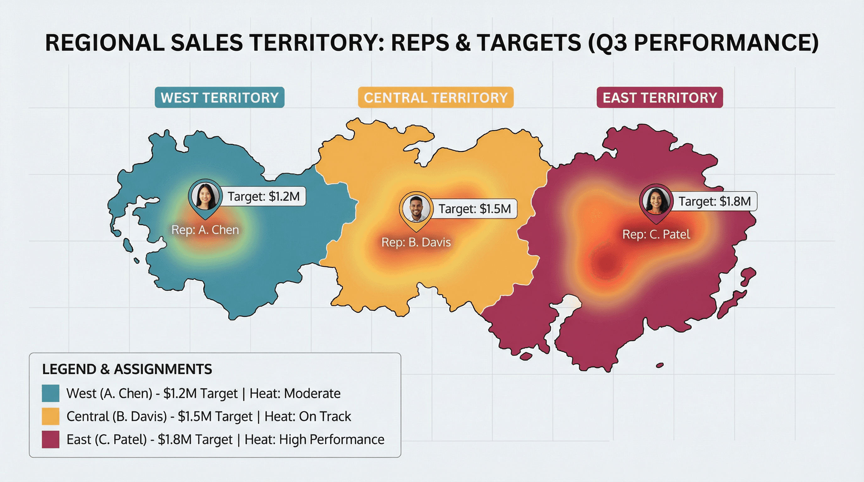 Design a slide with a regional sales territory map showing assigned reps and targets. Use a geographic visualization style with color-coded map regions, sales rep avatar pins, revenue target labels per region, heat map overlay showing performance, legend with territory assignments, and clean cartographic typography.