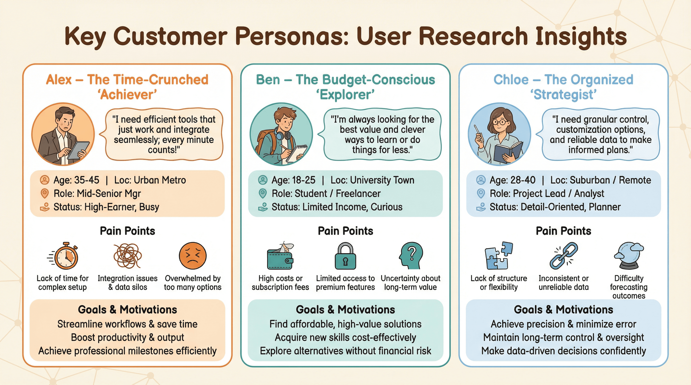 Design a slide presenting 3 key customer personas with demographics and pain points. Use a user research style with persona cards featuring illustrated avatar portraits, demographic stat blocks, quote callouts in speech bubbles, pain point icons, goal and motivation lists, warm approachable colors, and friendly rounded typography.