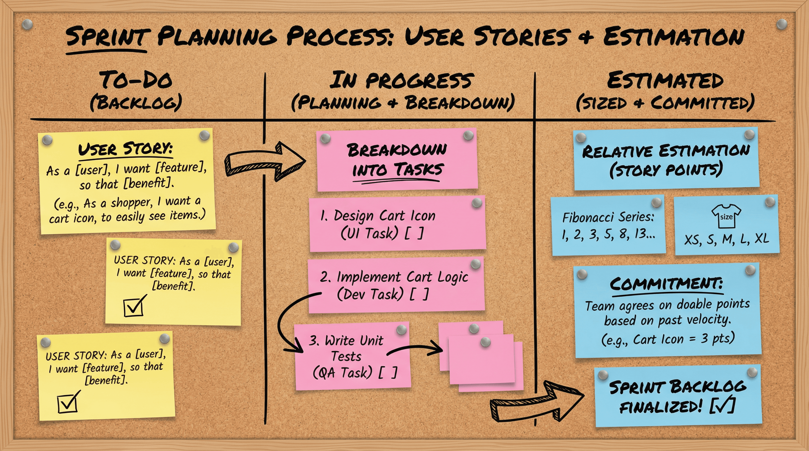 Design a slide explaining the sprint planning process with user stories and estimation. Use a Kanban board aesthetic with colorful sticky note graphics in yellow, pink, and blue on a cork board texture, handwritten marker-style fonts, push pin accents, to-do checkbox illustrations, and casual startup whiteboard energy with doodle arrows.