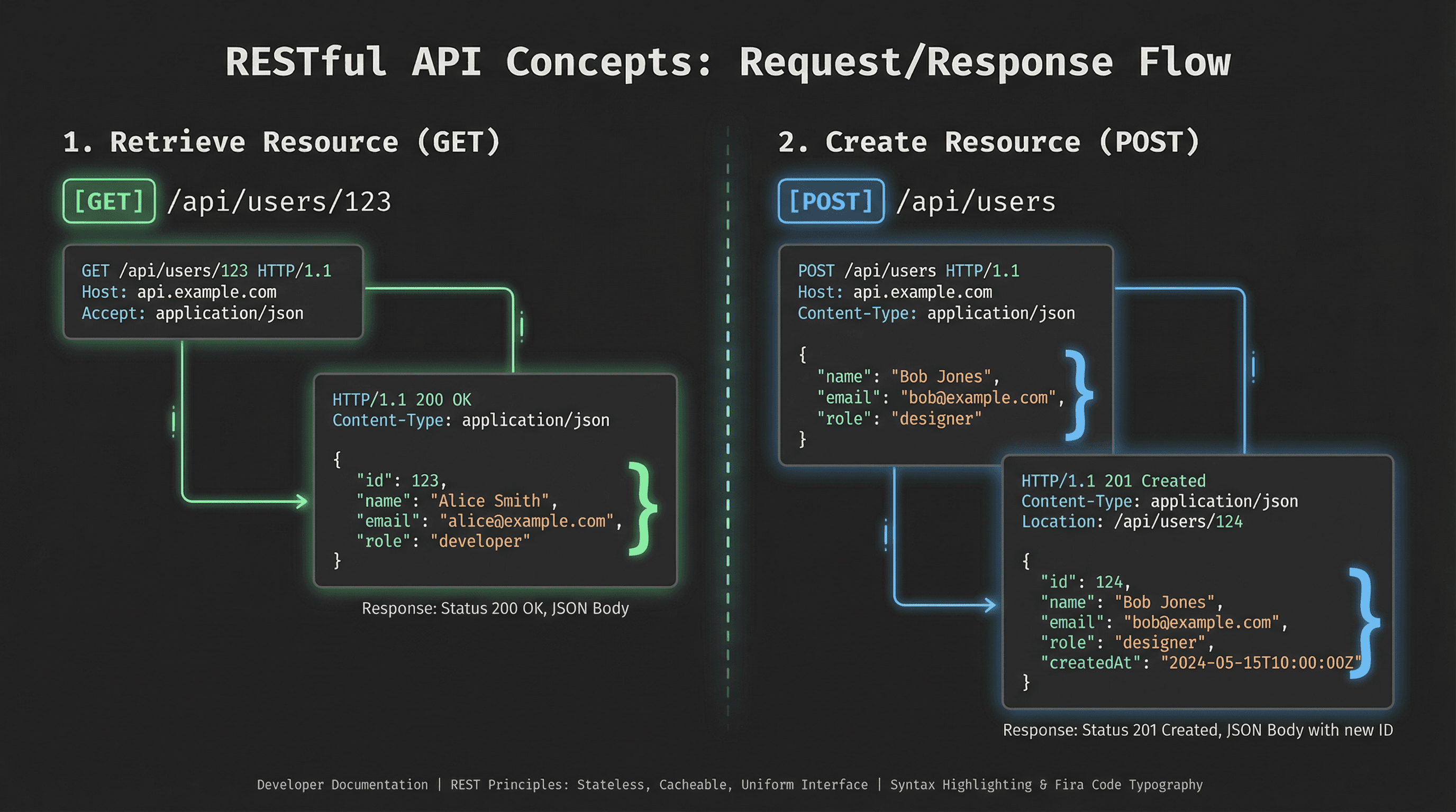 Create a technical slide explaining RESTful API concepts with request/response examples. Design in a developer documentation style with syntax-highlighted code blocks on dark background, JSON bracket graphics, HTTP method badges (GET in green, POST in blue), clean Fira Code typography, and subtle connection line animations between endpoints.
