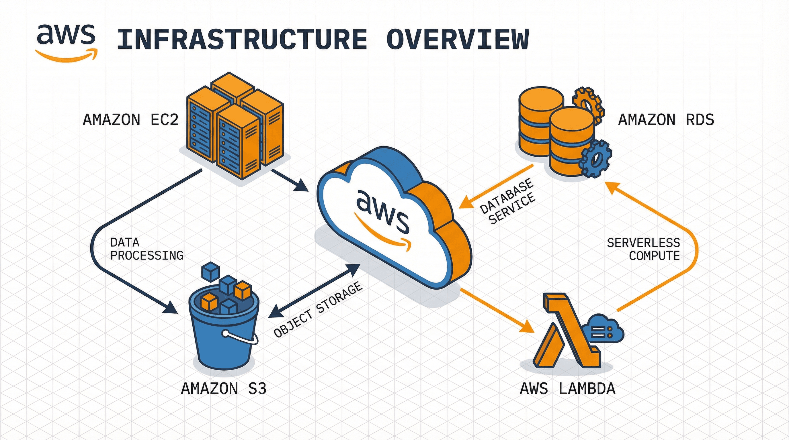 Create a technical slide showing AWS infrastructure with EC2, S3, RDS, and Lambda components. Design in official AWS style with their orange and dark blue color scheme, isometric 3D cloud and server icons, clean connector lines with data flow arrows, white background with subtle grid, and technical monospace fonts for labels.