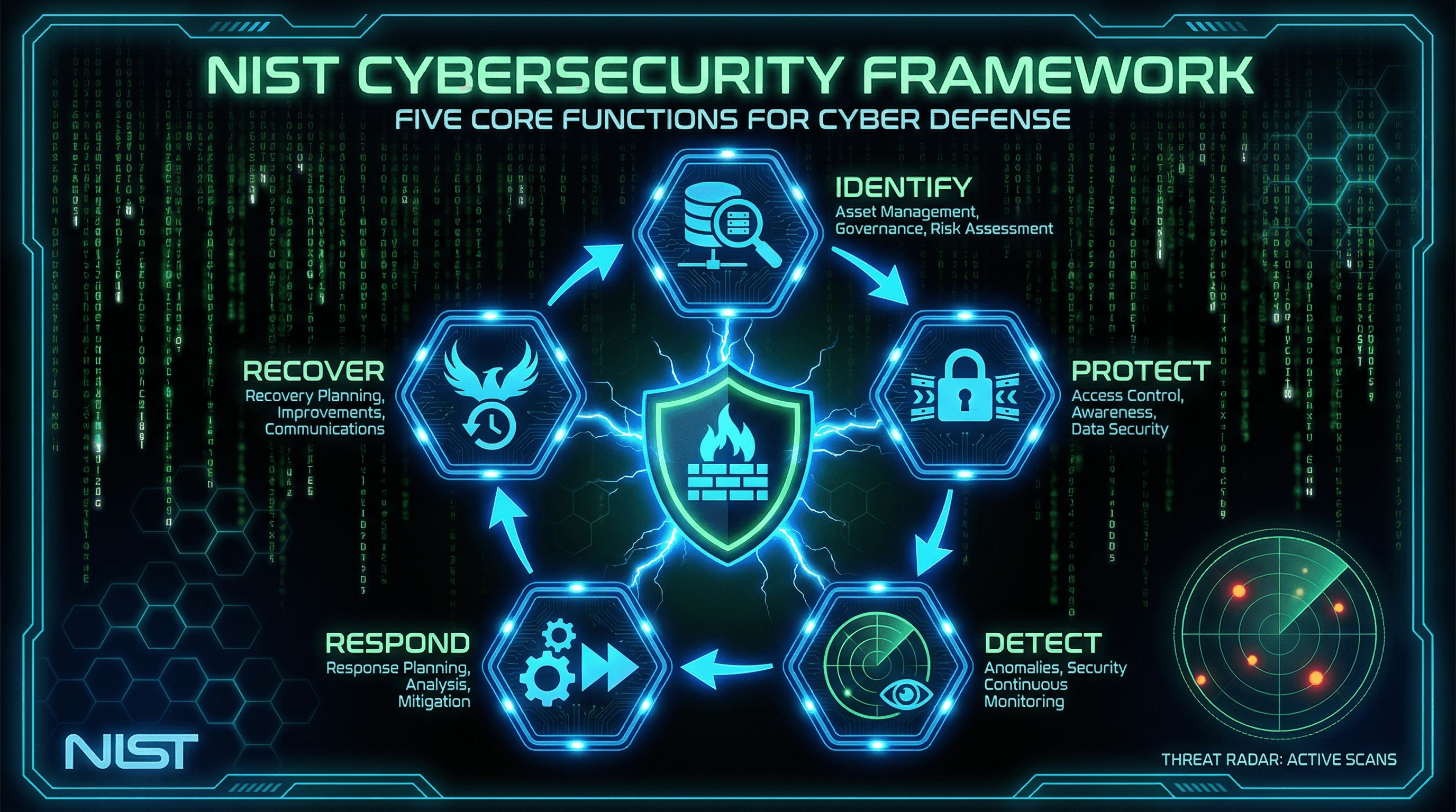 Design a slide presenting the NIST cybersecurity framework with five core functions. Use a cyber defense aesthetic with matrix-style green code rain background, shield and firewall iconography, dark background with electric blue accent glows, hexagonal grid patterns, threat radar graphics, and futuristic tech-noir typography.