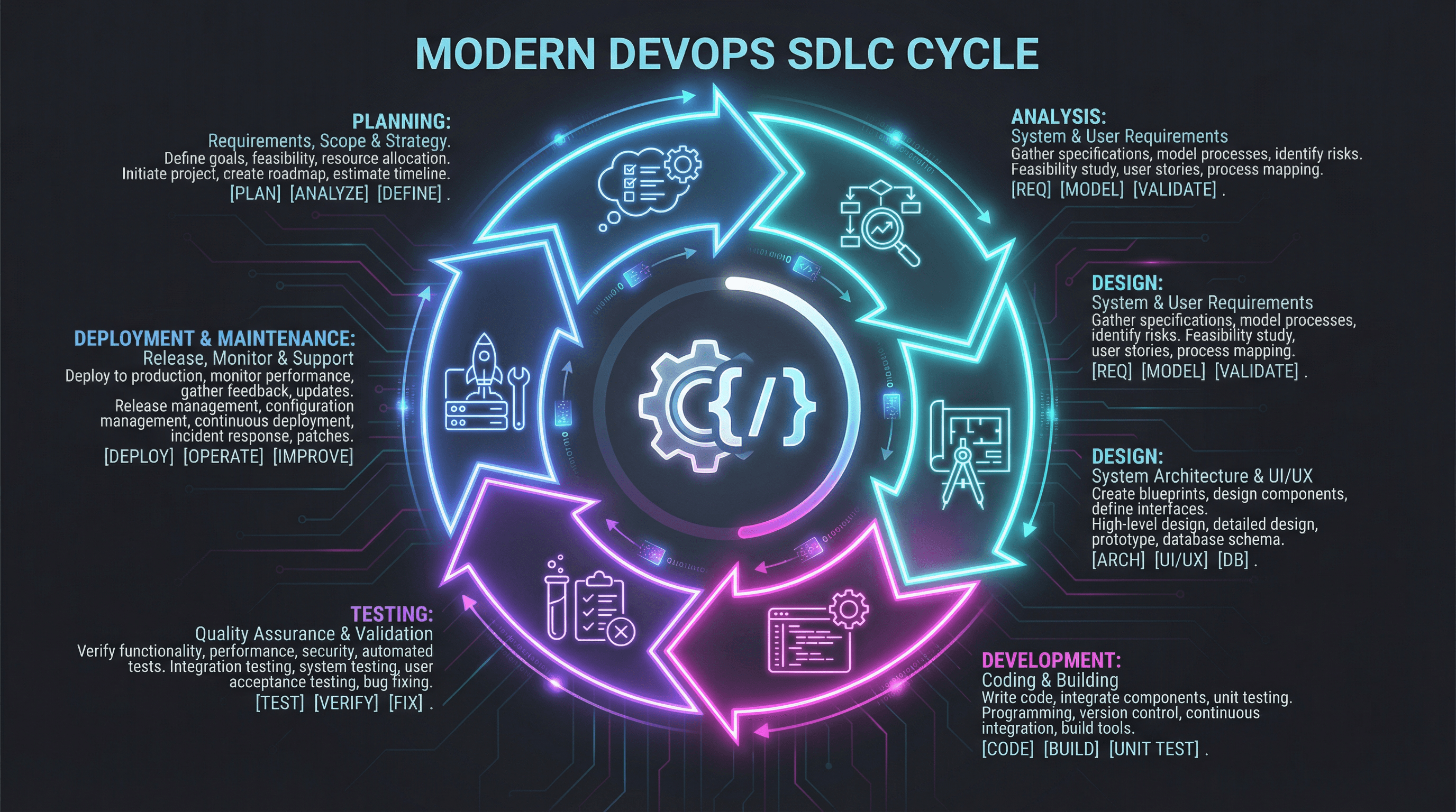 Design a circular diagram slide showing SDLC phases from planning to maintenance. Use a modern DevOps style with dark mode background (charcoal gray), neon gradient cycle arrows in cyan and magenta, gear and code bracket icons, terminal-inspired monospace typography, subtle circuit board pattern overlay, and glowing accent effects.